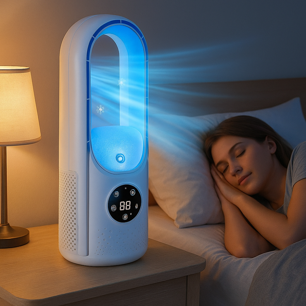 Mantente fresco con nuestro aire acondicionado que utiliza un diseño sin aspas para un enfriamiento silencioso y un flujo de aire suave. Este aire acondicionado portátil es ligero, fácil de mover y eficiente en energía, brindando comodidad fresca a dormitorios, oficinas y escritorios sin una instalación voluminosa. Controles simples, múltiples modos y un cuerpo compacto hacen de este enfriador portátil una opción inteligente para trabajar, estudiar y dormir.