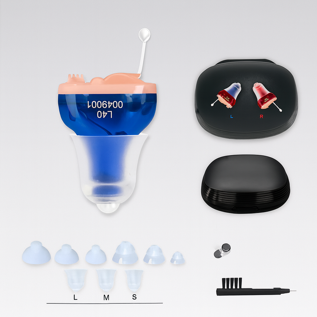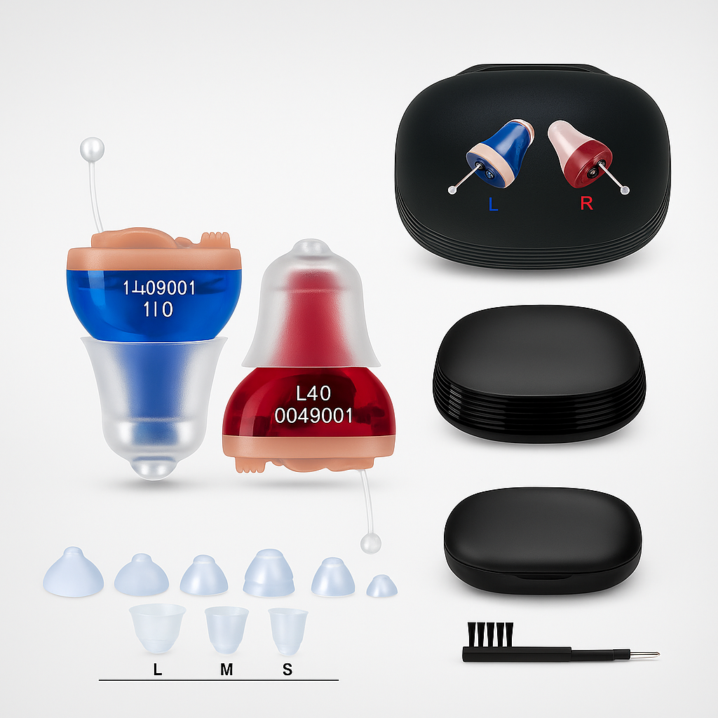 - 2 × Ładowalne aparaty słuchowe (lewy i prawy)